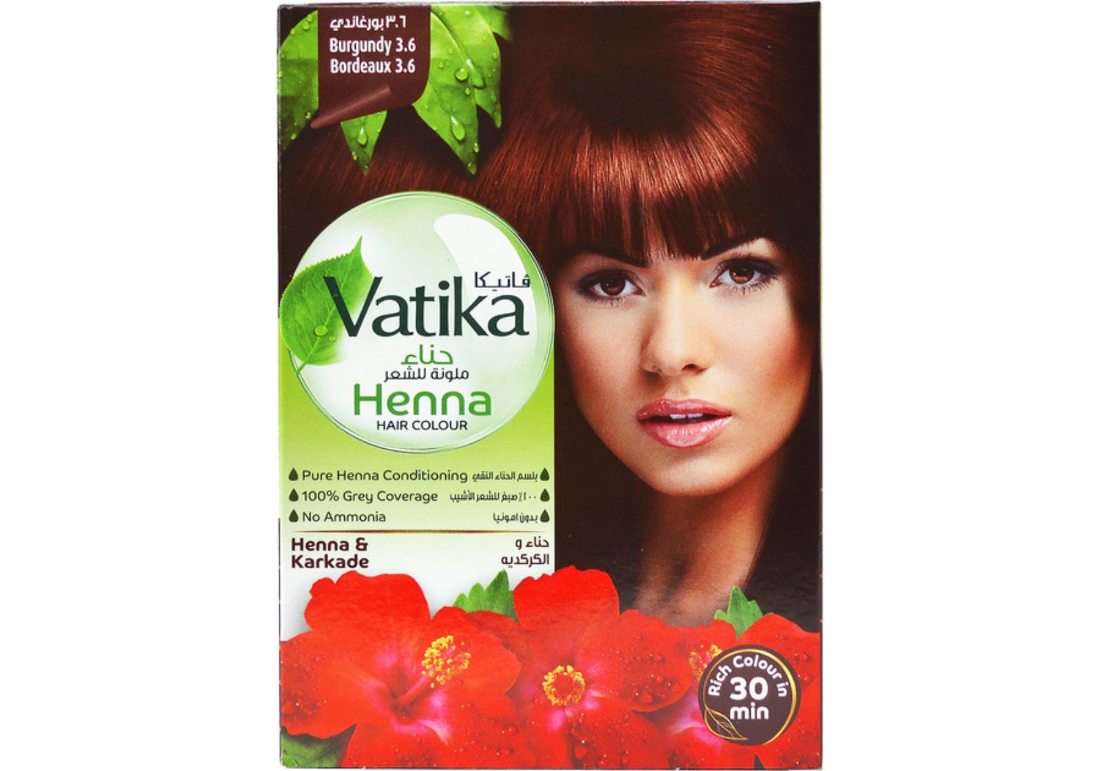 Краска для волос Dabur Vatika Henna Hair Colours (Colouring Powder) Burgundy (тон 3.6) с натуральной индийской хной – это совершенно новое решение для ухода и окрашивания волос. Содержит в составе растительные компоненты, способные создать насыщенный природный цвет волос, не травмируя их и не оставляя химического запаха. Ухаживающая и щадящая краска не оставит равнодушными модниц, привыкших заботится о своих локонах.