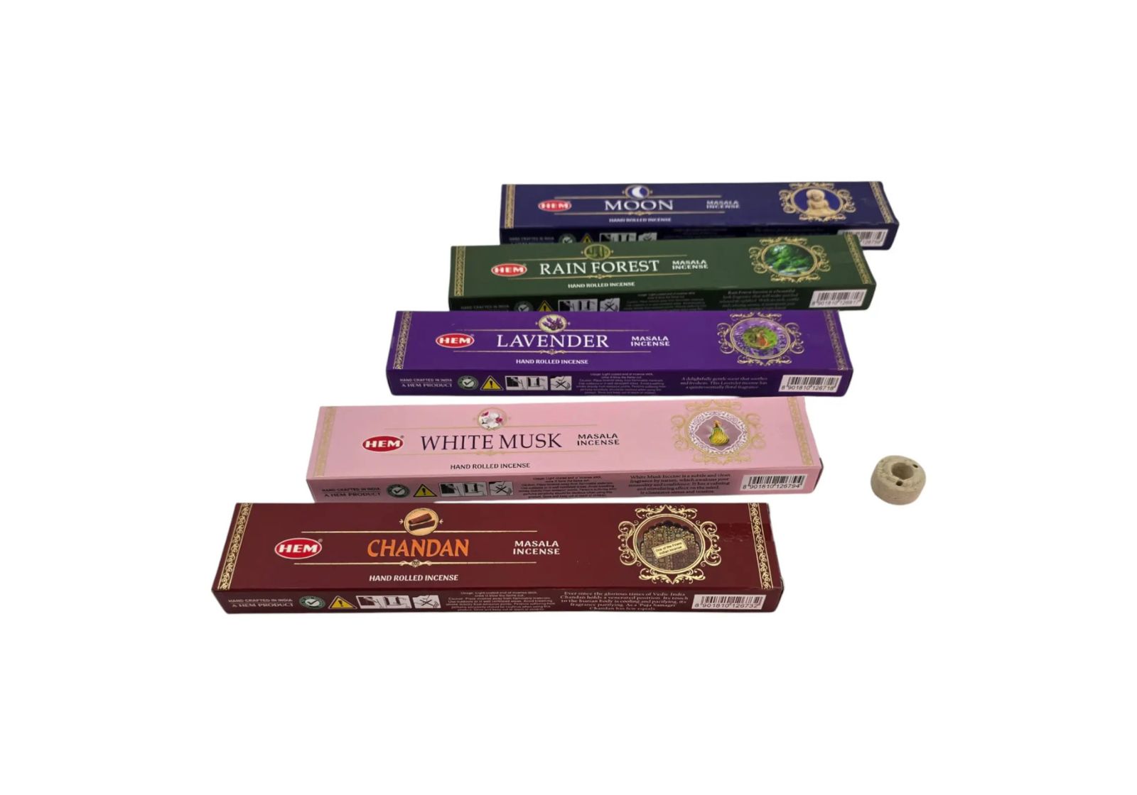 Подарочный набор индийских масала-благовоний HEM — это пять изысканных ароматов в формате классических аромапалочек. Каждая коробочка весом 15 г изготовлена вручную из натуральных растительных компонентов и эфирных масел. В комплект входит мини-подставка для удобного использования.