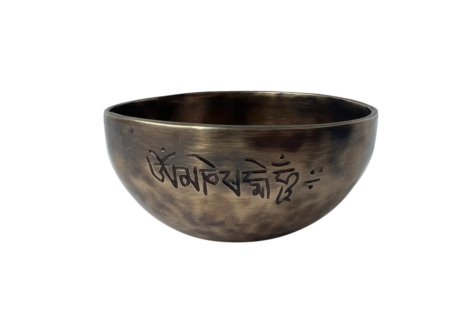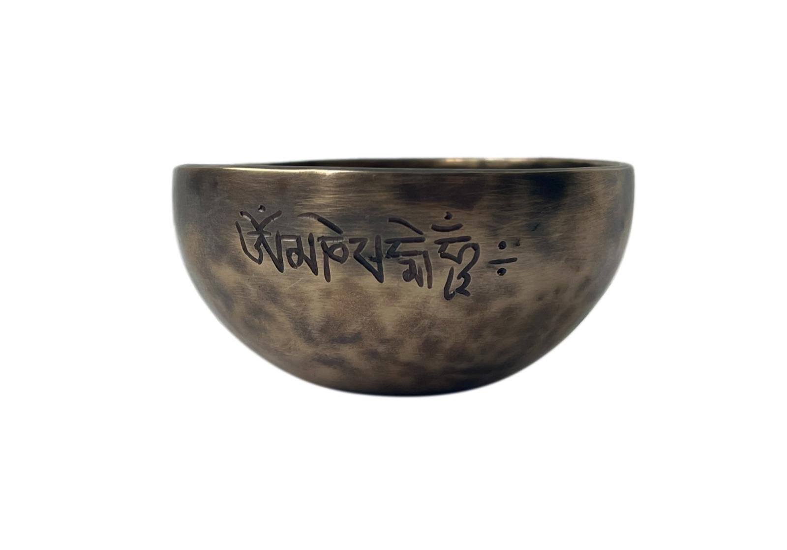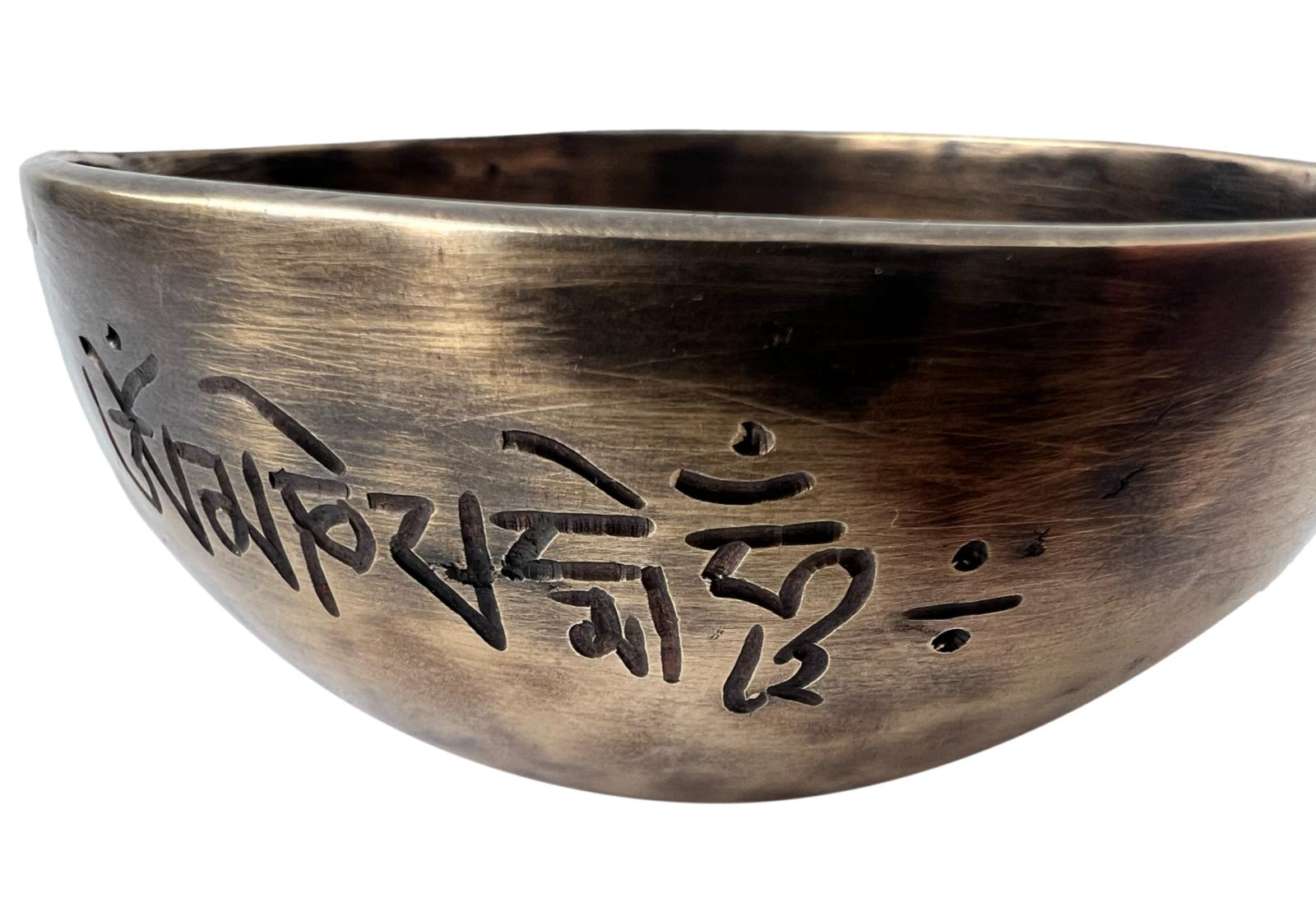 На чаше выгравирована одна из самых популярных и сильных мантр «Ом мани падме хум», которая призвана очищать, оберегать и привносить благополучие.
