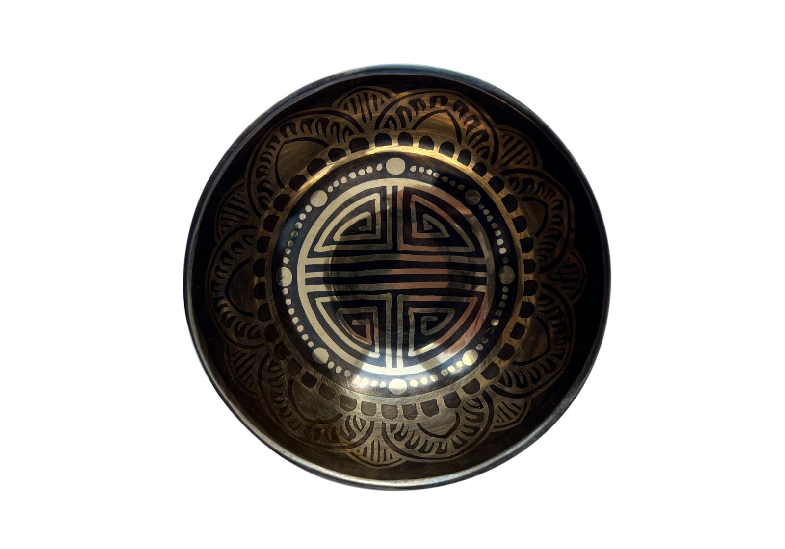 Мантра (по внешнему ободу чаши) – священный звук, который очищает пространство, устраняет хаос в мыслях и настраивает сознание на более высокий уровень осознанности. Звучание чаши с мантрой усиливает её защитные и гармонизирующие свойства.