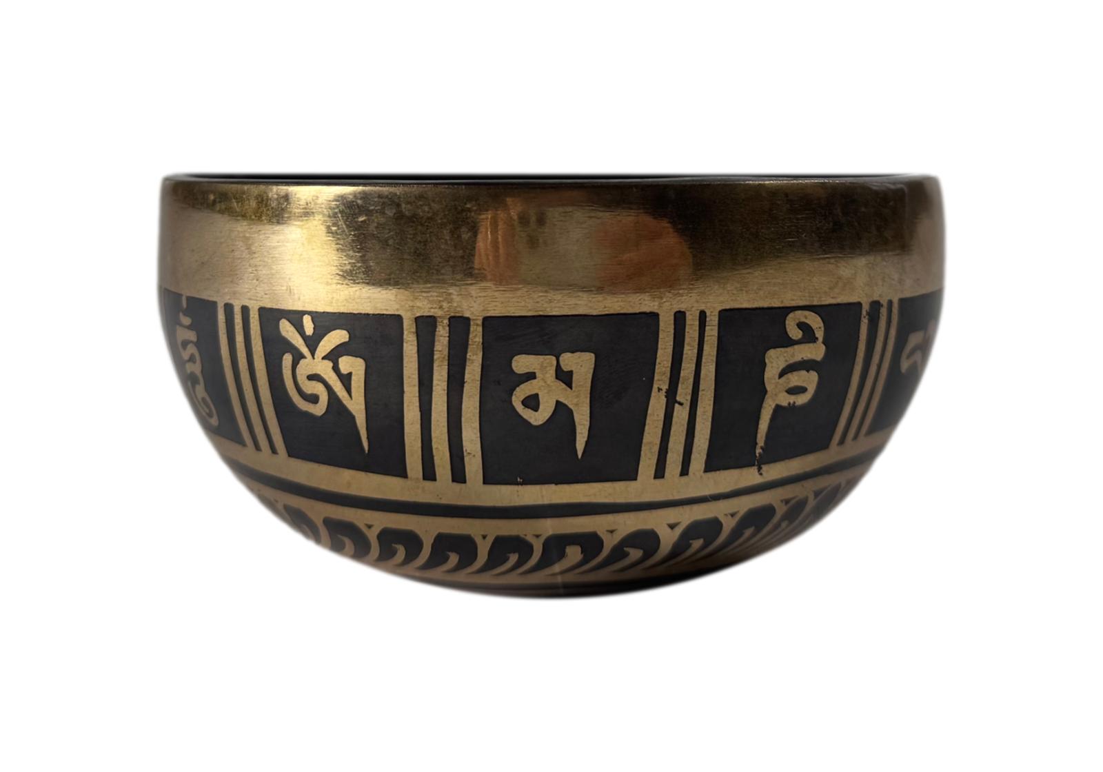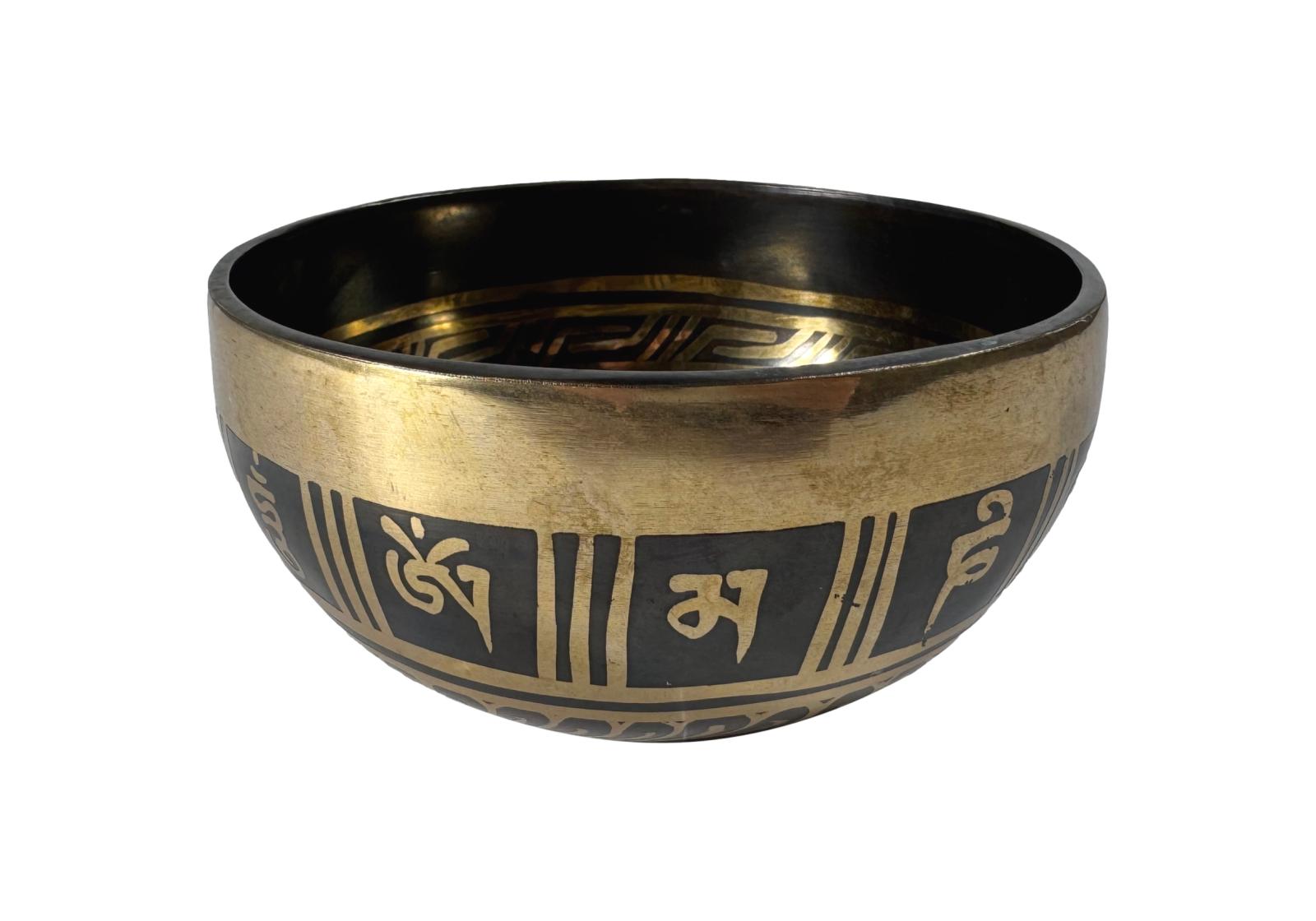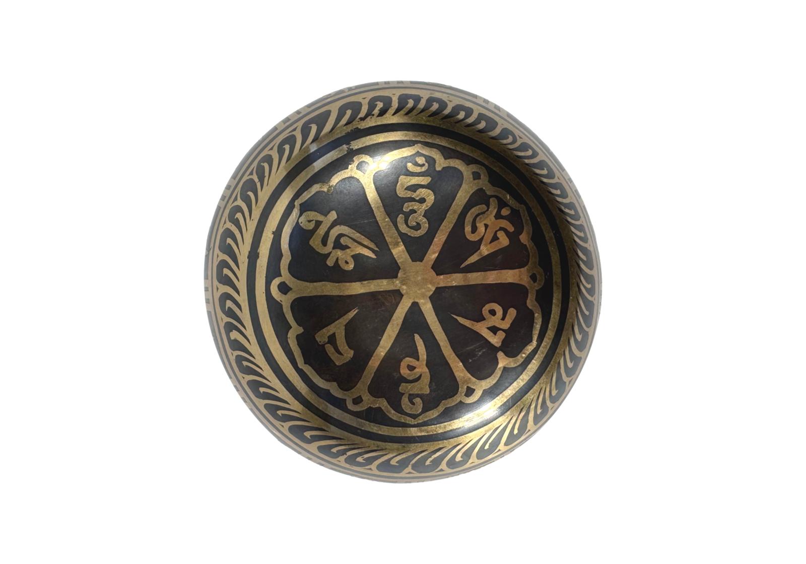 Мантра Ом Мани Падме Хум, выгравированная по ободу и дне чаши, усиливает её вибрационную чистоту и направляет звук как носитель сострадания, осознанности и духовного пробуждения.