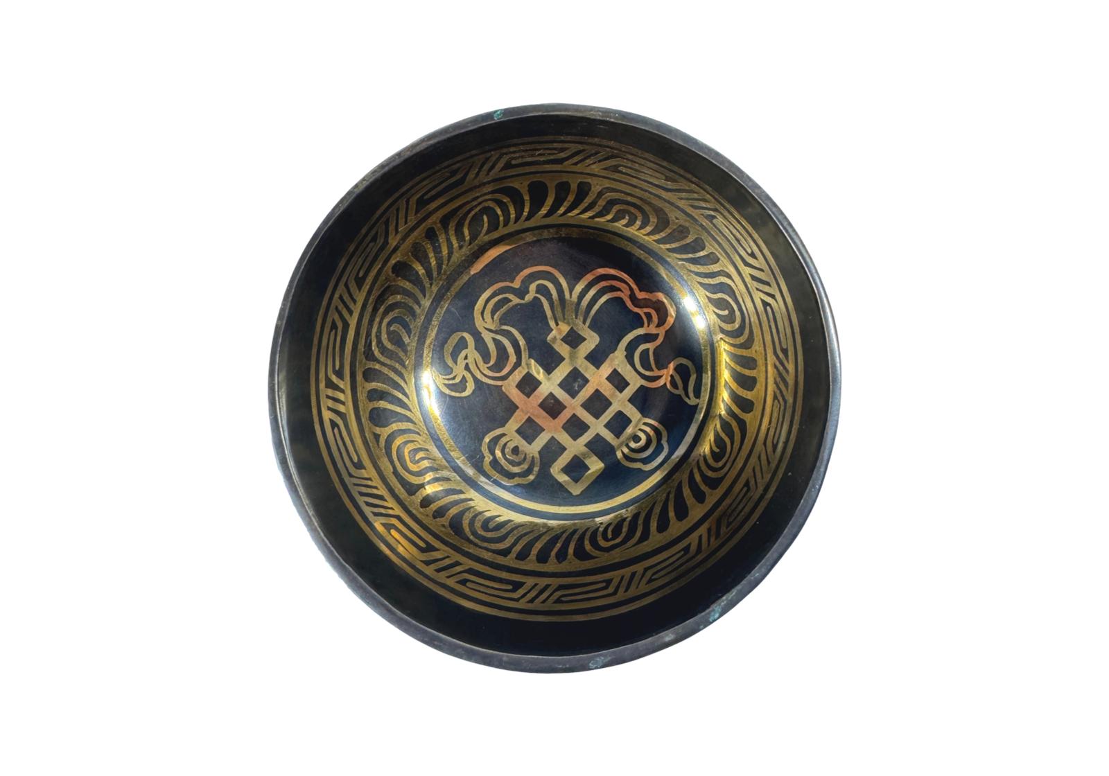 Эта тибетская поющая чаша объединяет в себе два мощных сакральных символа: Тибетский Узел Бесконечности (Шриватса) и мантру Ом Мани Падме Хум.