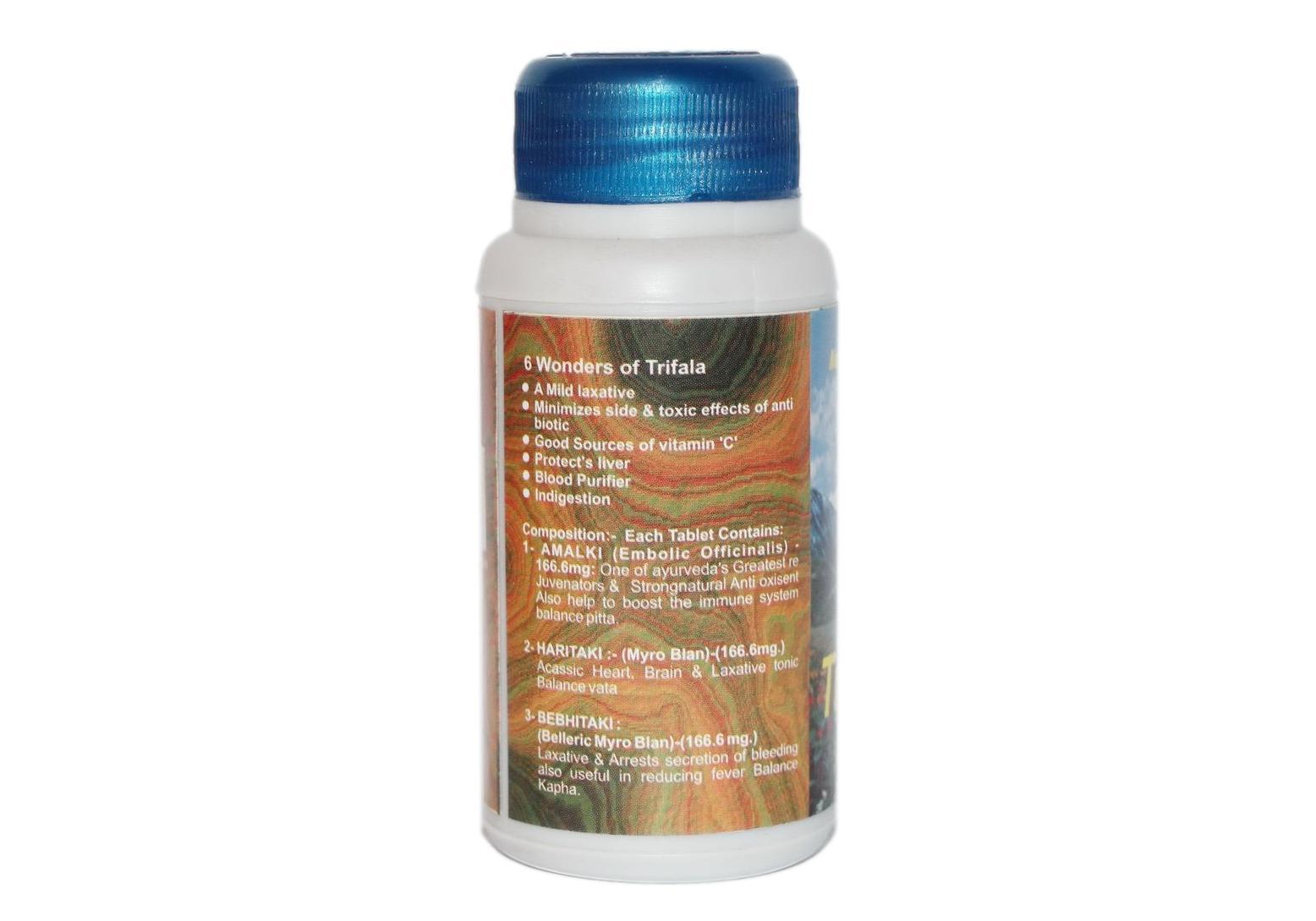 Состав: каждая таблетка содержит: 500 мг Трифала [сочетание плодов амалаки (Emblica officinalis) — 168 мг, плодов бибхитаки (Terminalia bellerica) — 166 мг, плодов харитаки (Terminalia chebula) — 166 мг].