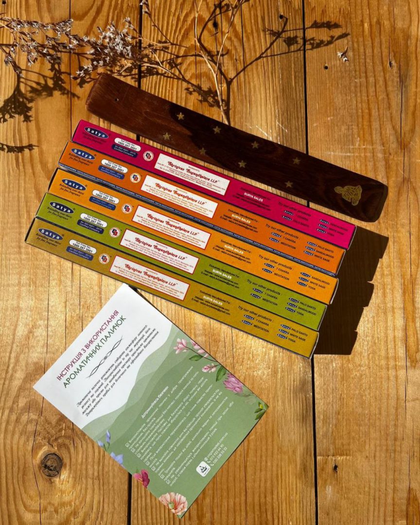 Склад паличок тішить своєю екологічністю: бамбукова основа, натуральний деревний наповнювач, найкращі натуральні індійські ароматичні олії. Поєднання таких матеріалів дозволяє уникнути надмірного диму та кіптяви під час тління пахощів. За більш ніж демократичну ціну ви отримуєте всесвітньо відомі натуральні ароматичні палички, виготовлені вручну в Індії, які благотворно впливають на загальний стан людини.
