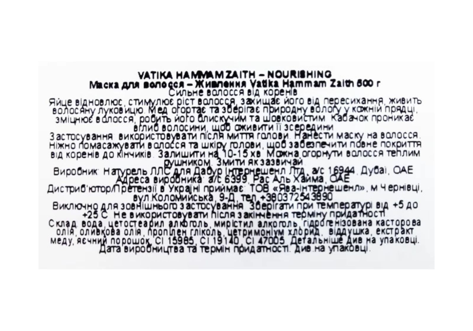 Компоненти у складі: Soft water, Cetostearyl alcohol, Myristyl Alcohol, Hydrogenated Castor oil, Virgin Olive Oil, Magnesium Chloride, Egg Powder, Honey extract, Pаrfum Hamam Mod, Citric Acid (Monohydrate) IP, CI 15985, CI 19140, CI 47005.