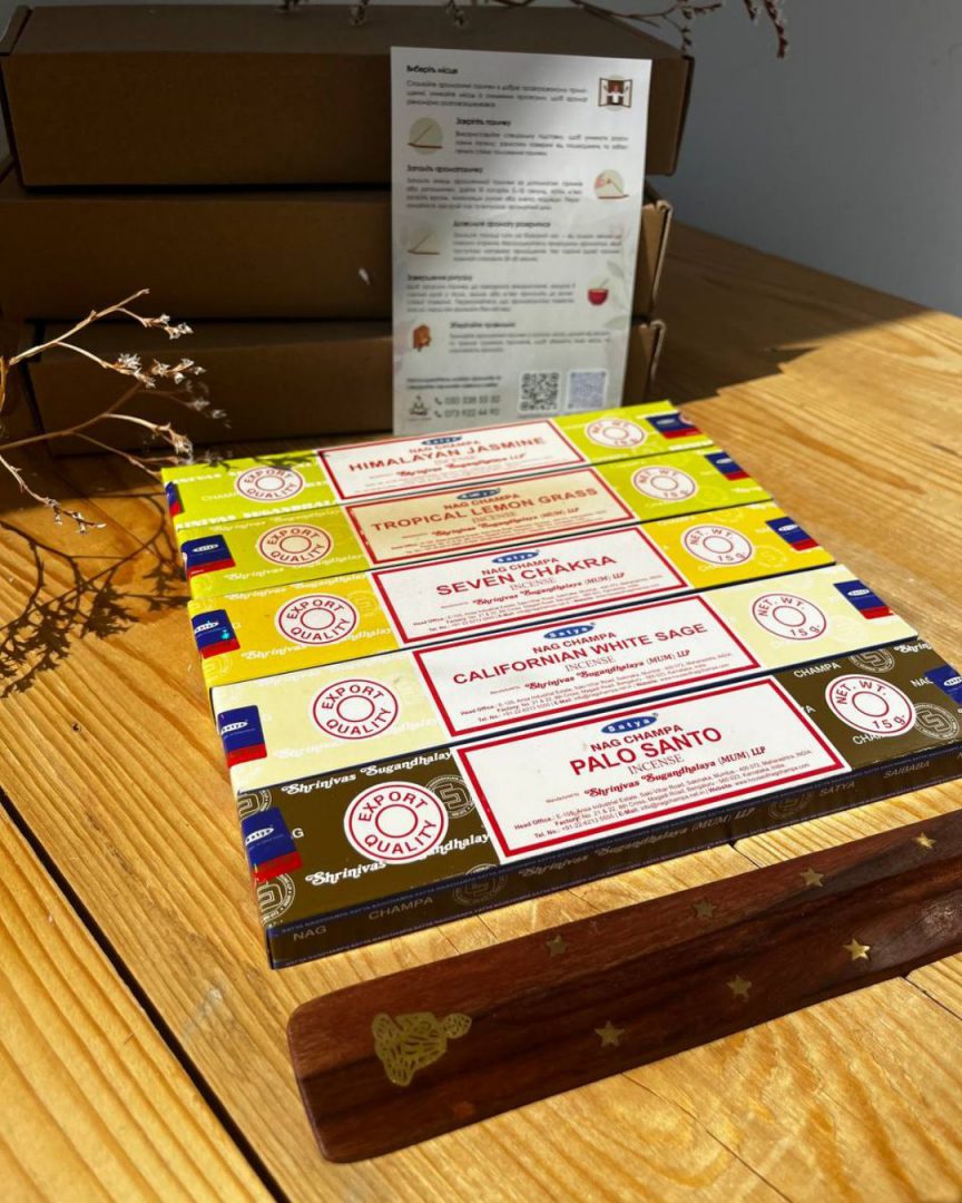 У набір також входить підставка для спалювання пахощів. Вона призначена для фіксації ароматичної палички та захисту меблів або одягу від попадання гарячого попелу під час тління пахощів. В основі установки паличок є спеціальний отвір, а по всій довжині розташоване невелике поглиблення для збору попелу.