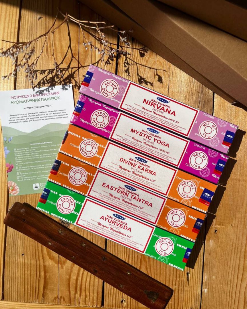 У наборі автентичні індійські аромапалочки зроблені вручну з якісних, ретельно відібраних інгредієнтів. А для вашої зручності та найголовніше безпеки додали дерев’яну підставку для спалювання пахощів з натурального дерева.
