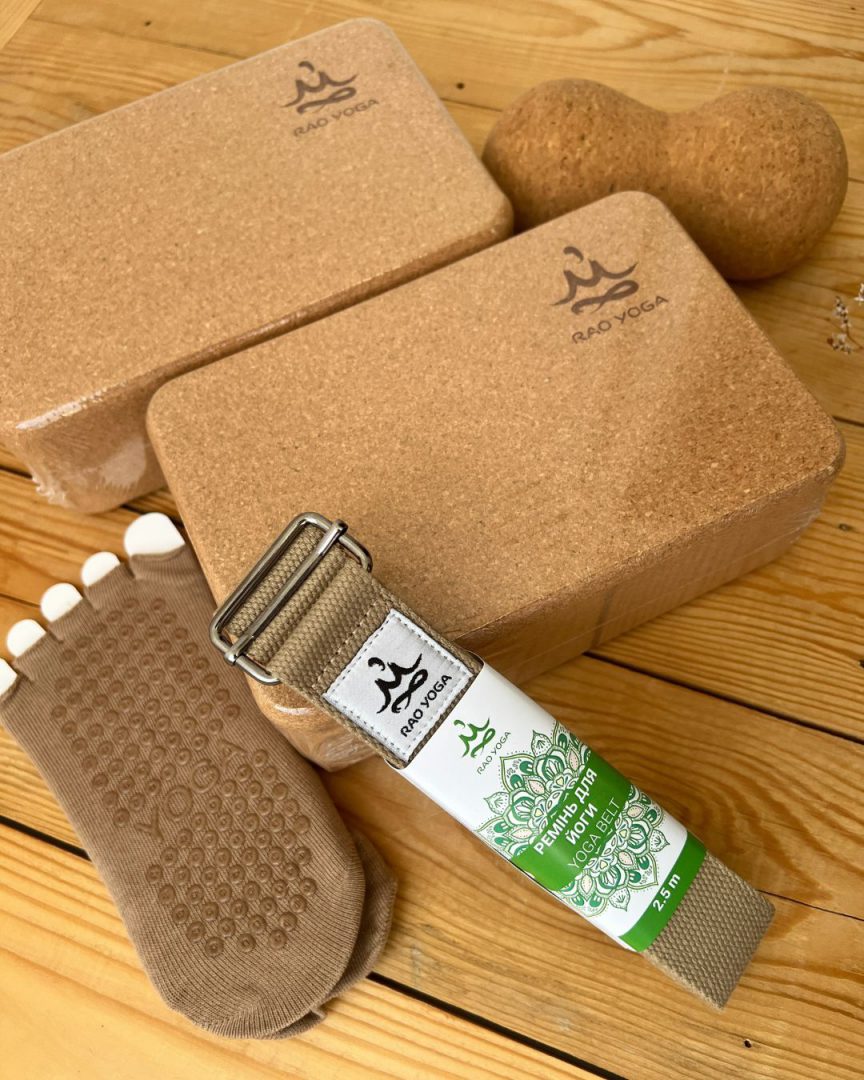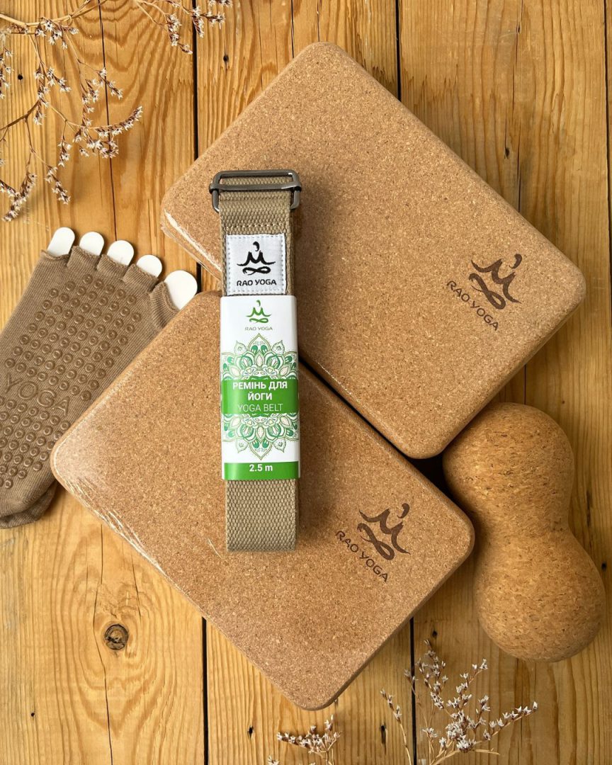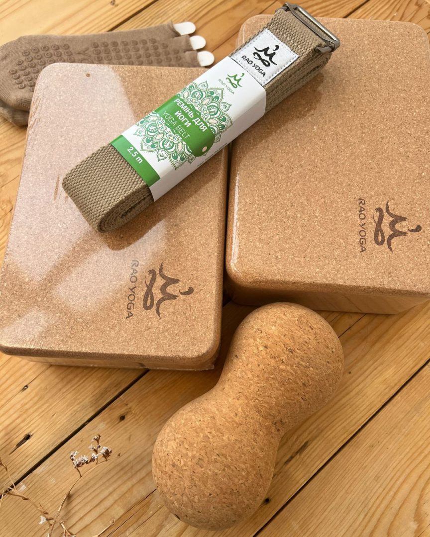 - 2 пробкові блоки для йоги RAO – допомагають утримувати рівновагу, безпечно виконувати складні асани та поглиблювати розтяжку.