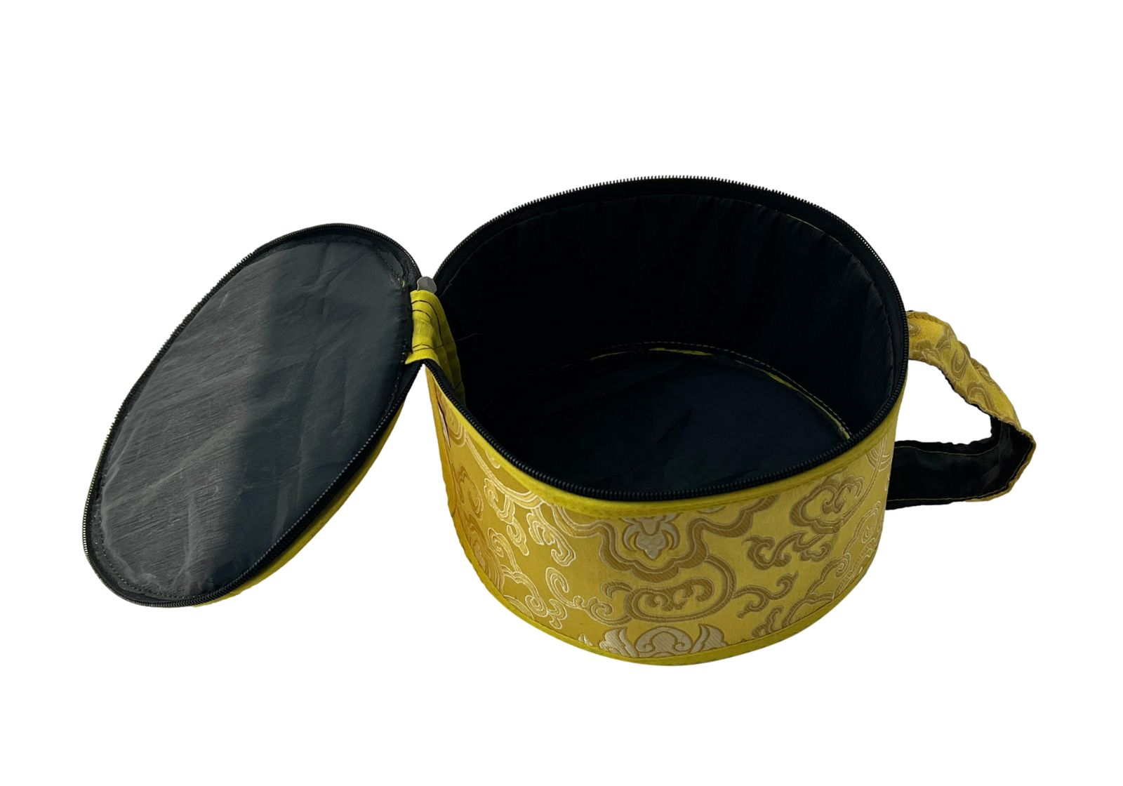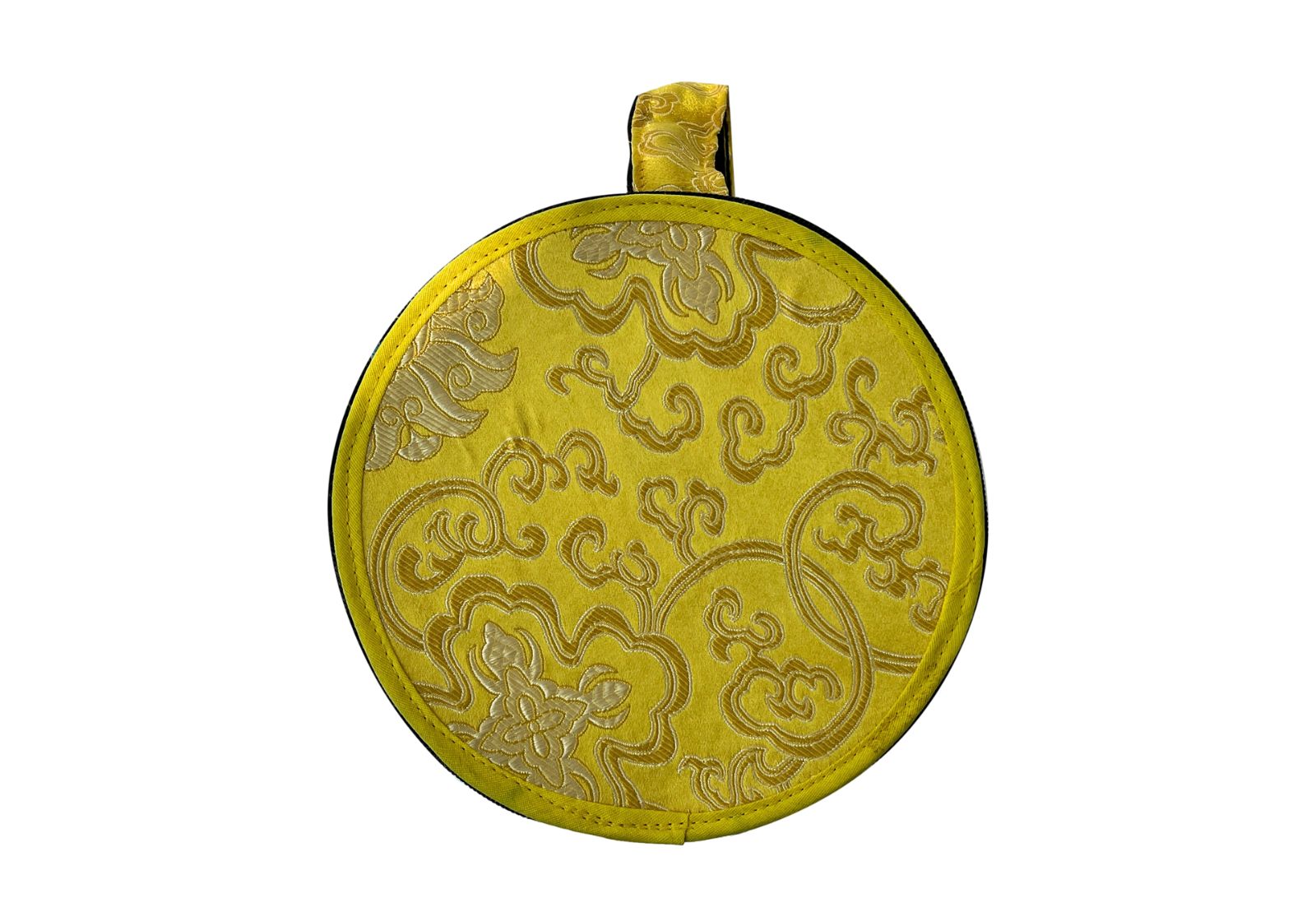 Міцний та естетичний парчовий бокс жовтого кольору із золотими візерунками – ідеальне рішення для зберігання та транспортування тибетської співаючої чаші та додаткових аксесуарів. Завдяки збільшеному розміру (діаметр 19 см, висота 11 см) та зручній ручці, він вміщує не тільки саму чашу, але також подушку-бублик та резонатор (залежно від їх розміру).