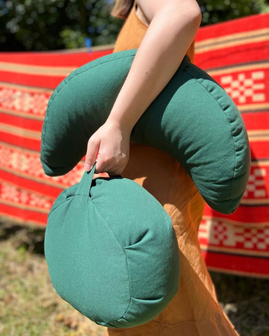 Подушка для медитації у формі півмісяця виготовлена на 100% у ручну, має екологічний наповнювач (гречане лушпиння). Матеріал зносостійкий та легкий у догляді.