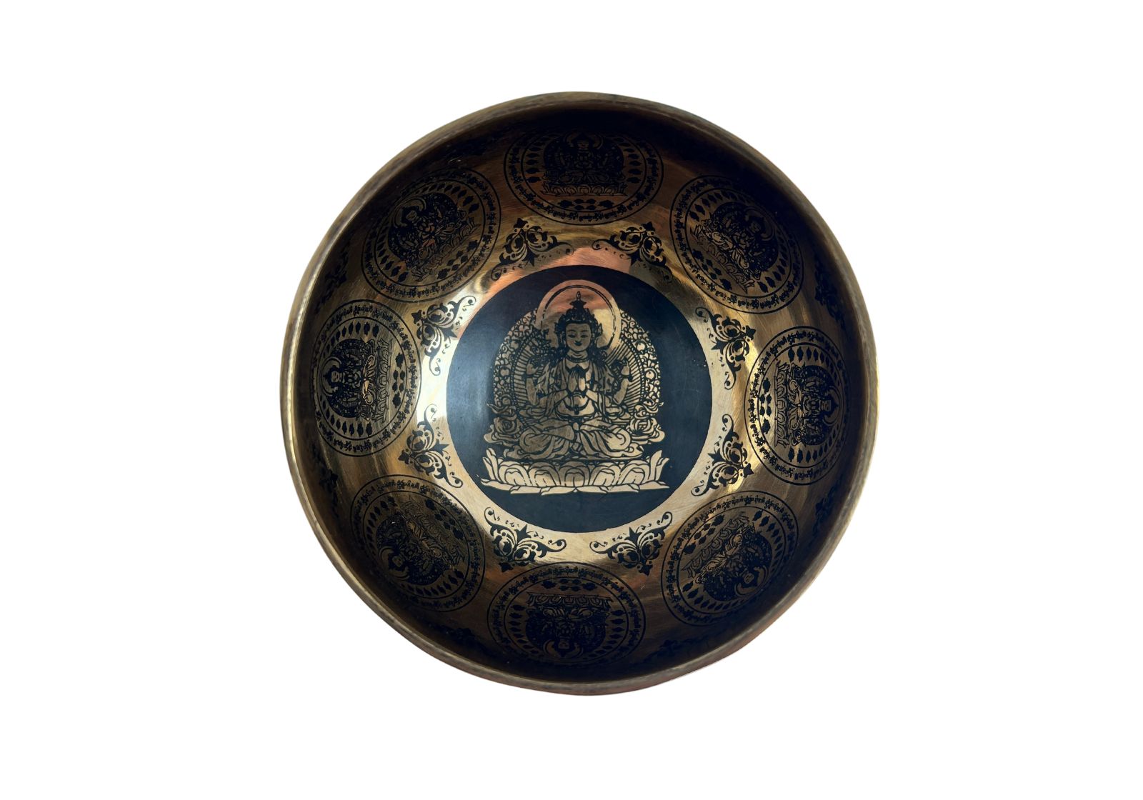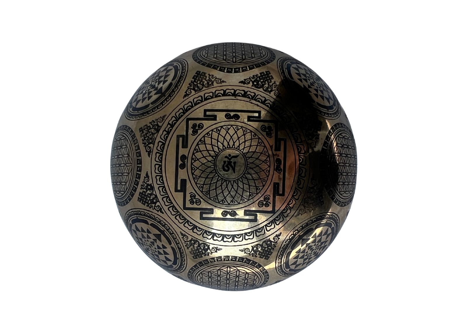 Тибетська співаюча чаша ручної роботи, виготовлена в Непалі з традиційного сплаву 7 металів, діаметром 10 см. Прикрашена глибоко символічними гравіюваннями: Авалокітешвара – втілення співчуття, мантра Ом Мані Падме Хум, Шрі Янтра на дні та Квітка Життя за зовнішнім обідом.