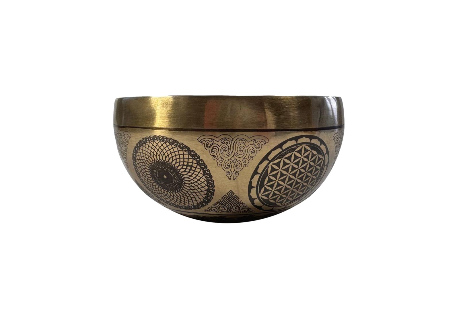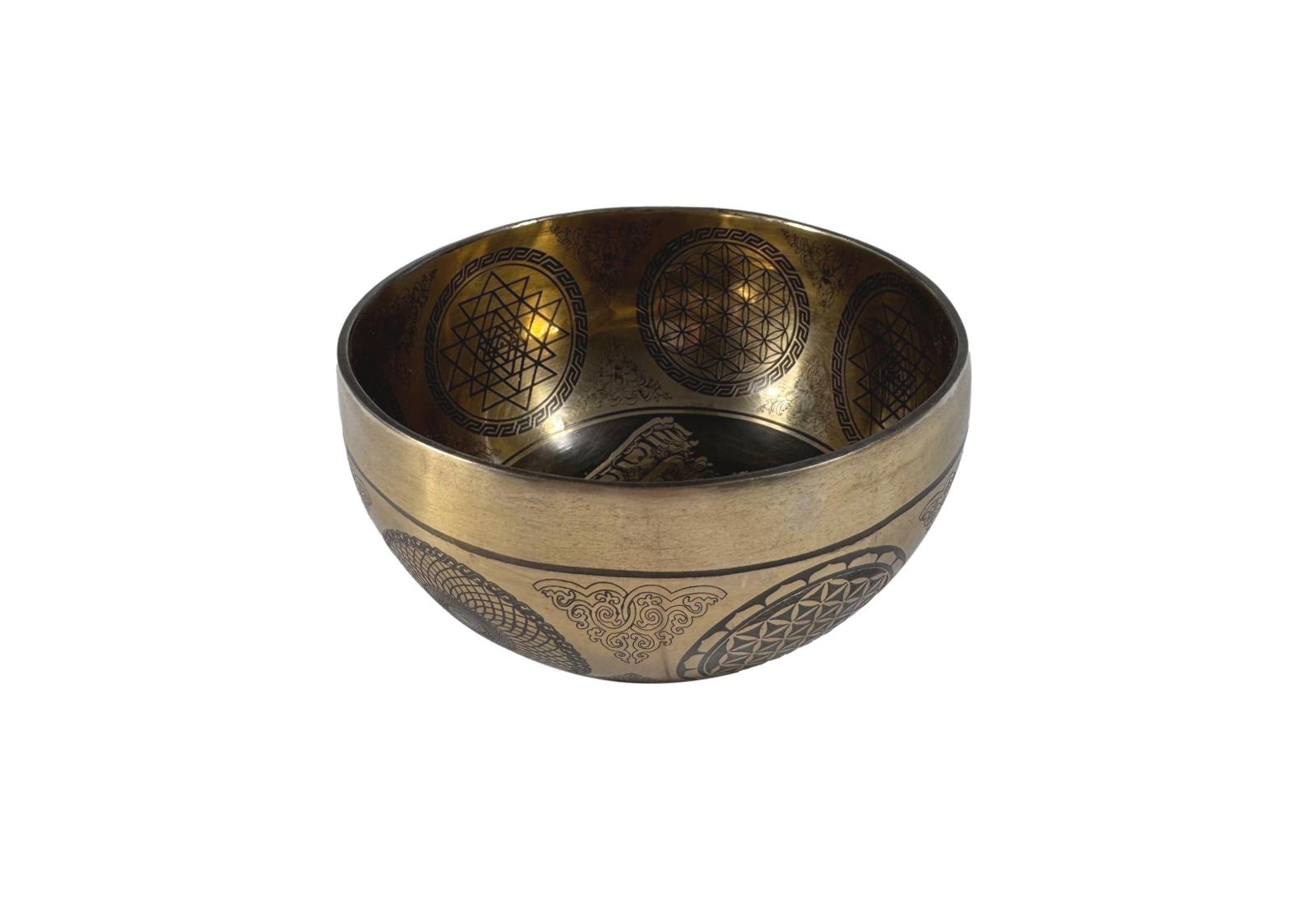 Тибетська співаюча чаша ручної роботи діаметром 14 см, прикрашена складною сакральною символікою, що поєднує буддійську, тантричну та універсальну геометрію. Це не просто інструмент для звукових практик — це енергетичний артефакт, створений для глибокої медитації, очищення простору, звукотерапії та роботи з наміром.