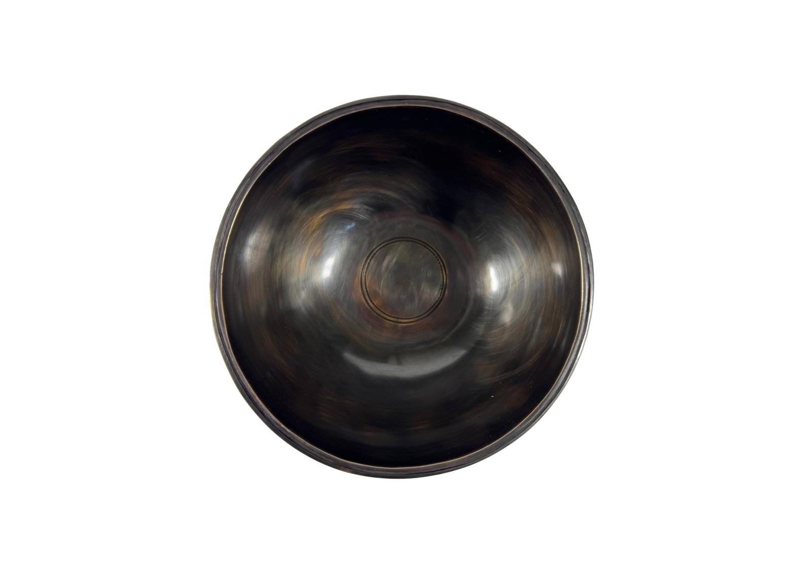 Тон чаші низький, насичений, «землистий», із плавною вібрацією, яка наповнює простір і сприяє глибокому розслабленню. Завдяки товщині стінок чаша довго утримує звукову хвилю та створює рівне, стійке звучання без різких перепадів.