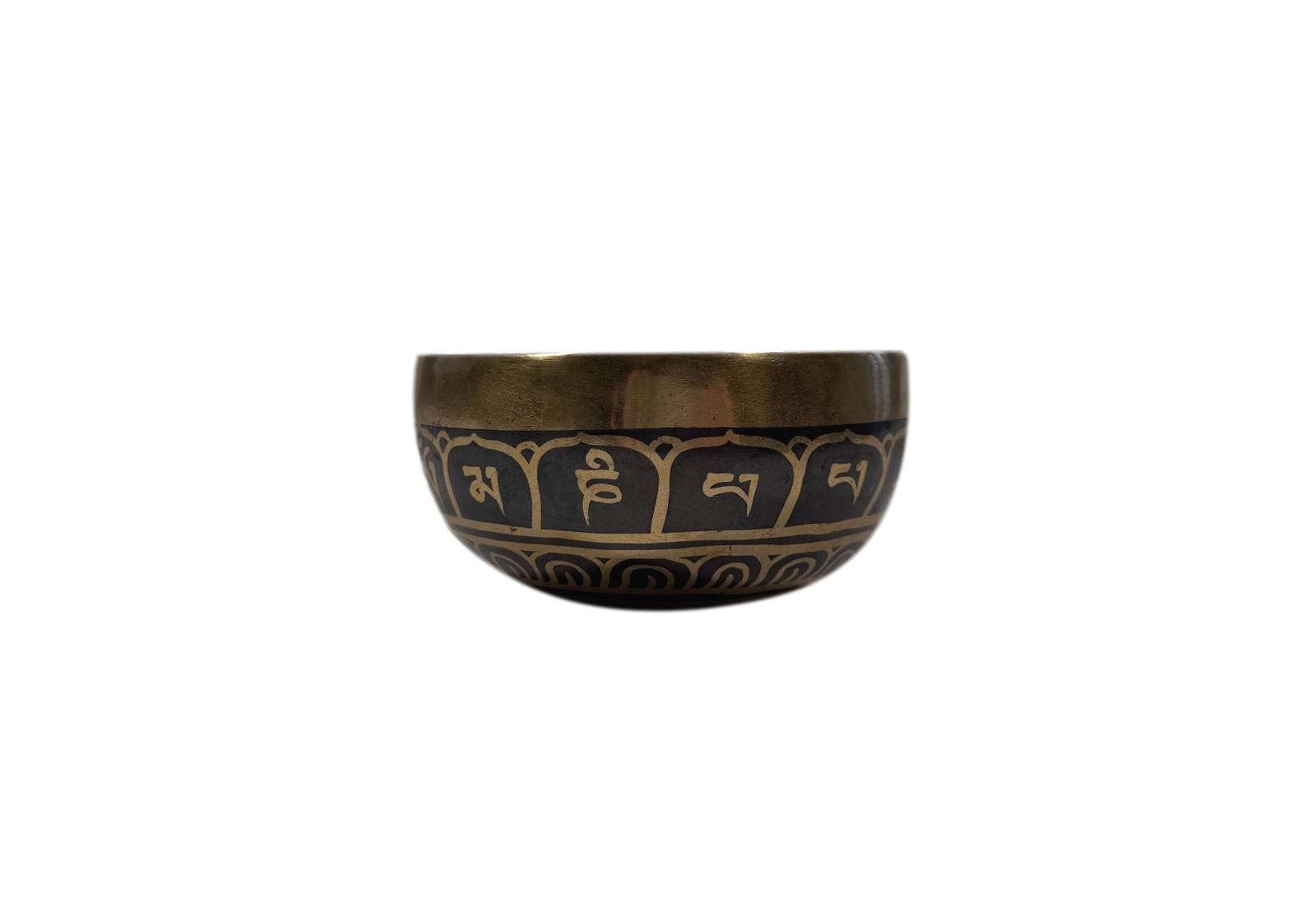 Мантра Ом Мані Падме Хум, вигравійована по ободу та дні чаші, підсилює її вібраційну чистоту й спрямовує звук як носій співчуття, усвідомленості та духовного пробудження.