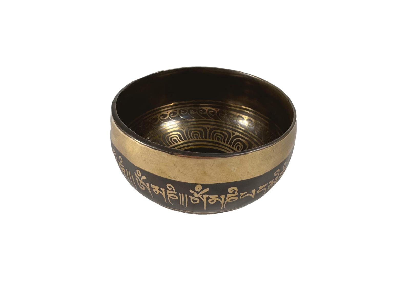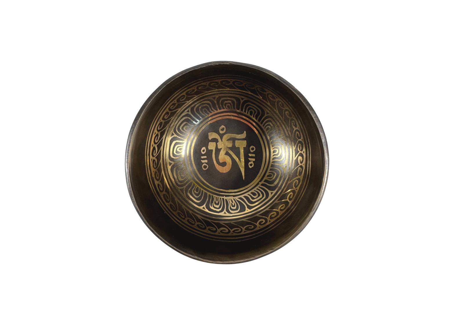 Співаюча чаша з Непалу із золотим візерунком та зображеннями: Очі Будди, Мантра, 12,5 см.
