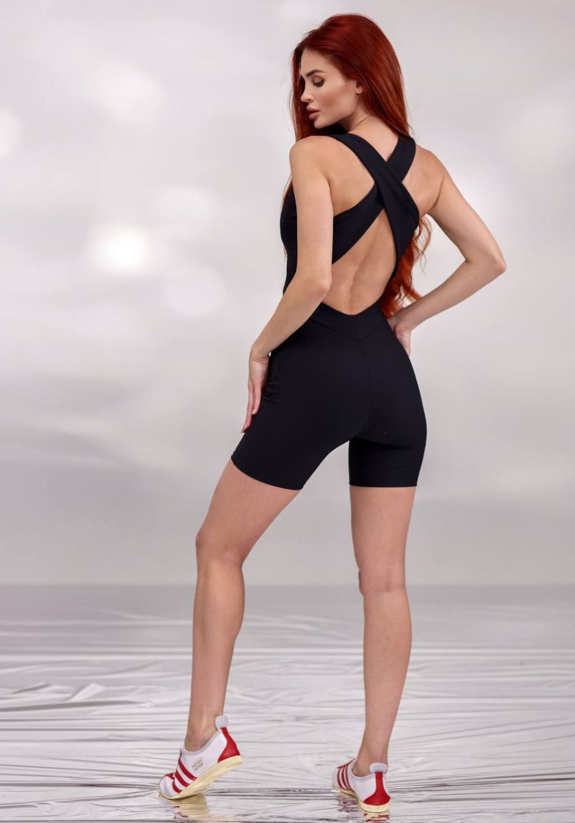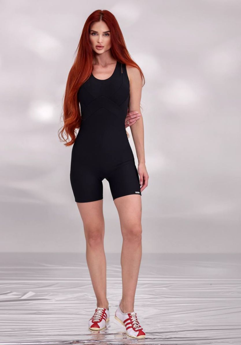 Жіночий комбінезон виготовлений із щільної спортивної тканини у рубчик (85% поліестер, 15% еластан). Матеріал «дихає», добре тягнеться, має легкий утягуючий ефект, підкреслює фігуру та забезпечує свободу рухів. За бажанням можна вставити чашки (оплачуються окремо) для регульованої підтримки. Відкрита спинка надає образу жіночності та вишуканості.